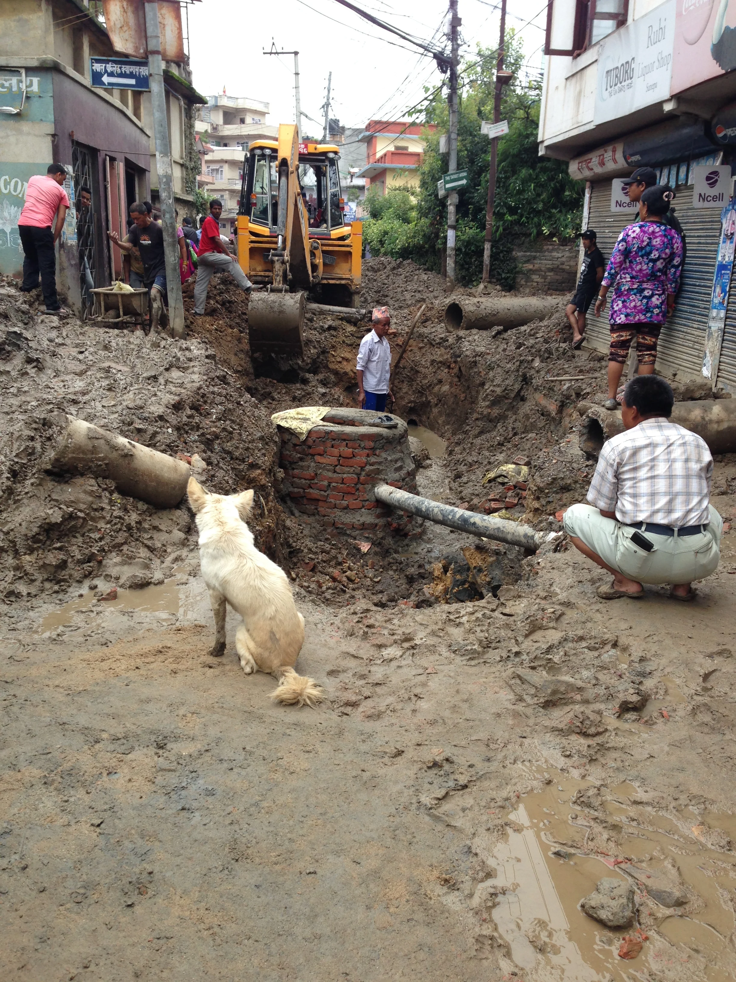 Construction is another common sight in Kathmandu and we had sewage and drinking water pipe construction in our neighborhood for several days during the month of July. As anyone who has been to Kathmandu in July can tell you, the rainy season here is not pretty and it made the construction all the more difficult to navigate. We couldn’t take our cars to the office building and had to park on the curb throughout this time. It might sound bizarre, but we had to walk through the road that seemed like it was covered three inches of melted chocolate, the kind that you never want to taste! You can see in the picture what we had to walk through! Thankfully, the construction is complete and we are getting to the point where I don’t have to think multiple times before I decide which shoes to wear to work.
